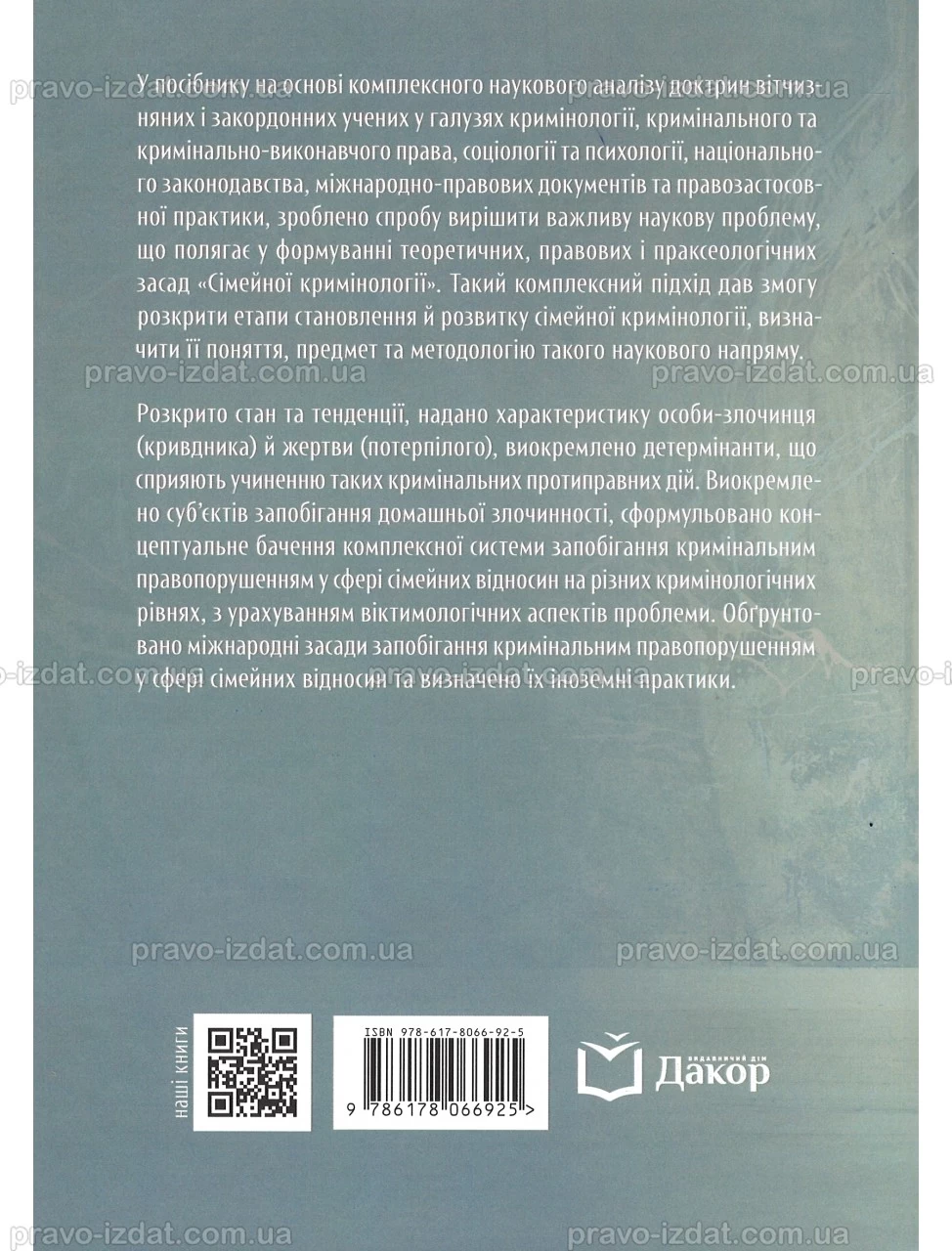 У посібнику на основі комплексного наукового аналізу доктрин вітчизняних і закордонних учених у галузях кримінології, кримінального та кримінально-виконавчого права, соціології та психології, національного законодавства, міжнародно-правових документів та правозастосовної практики, зроблено спробу вирішити важливу наукову проблему, що полягає у формуванні теоретичних, правових і праксеологічних засад «Сімейної кримінології». Такий комплексний підхід дав змогу розкрити етапи становлення й розвитку сімейної кримінології, визначити її поняття, предмет та методологію такого наукового напряму.